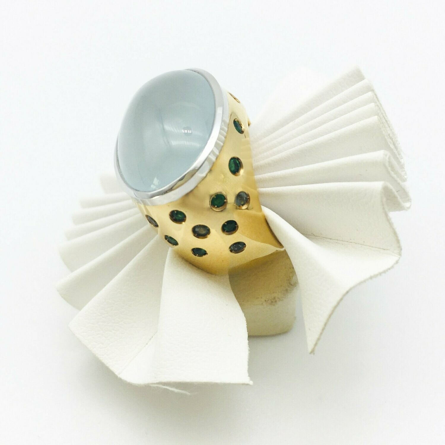 Damenring:18 Karat Gelb und Weißgold, Aquamarin und Smaragd, Blautopas gefasst und eingerieben Aquamarin 14,70 ct Schliff: Cabochon Blautopase und Smaragd 0,49 ct. Aquamarine erfüllen das Leben mit mehr Glück und Begeisterung.